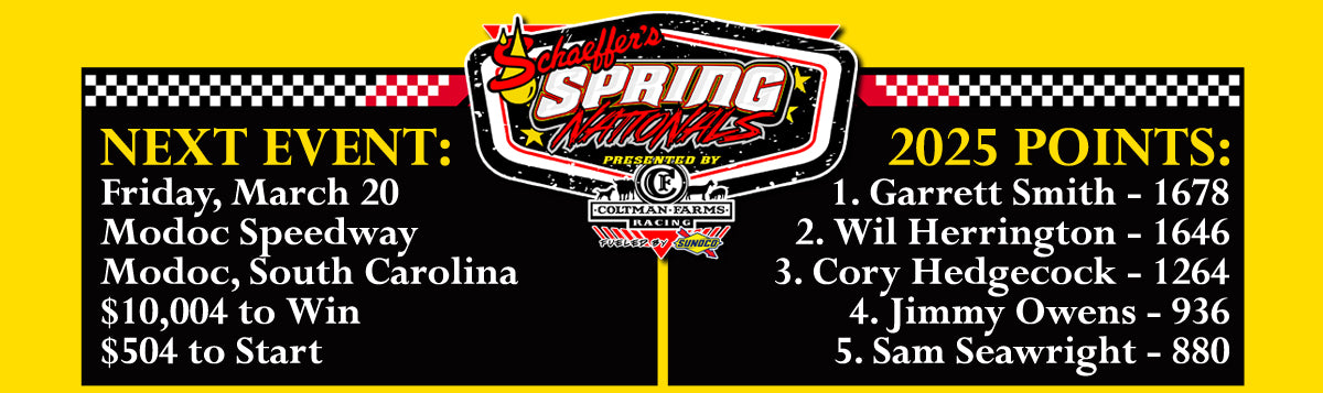 The 2026 Schaeffer’s Oil Spring Nationals Series presented by Coltman Farms Racing and fueled by Sunoco season was set to get underway on February 27-28 in a doubleheader at Swainsboro...